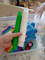 Игрушка-антистресс Pop Tubes очень популярна сейчас у детей, и моей дочке тоже захотелось купить такую игрушку. Выглядит она у нас вот так. Она не сильно большого размера. Эта игрушка может растягиваться, сворачиваться в колечко, ее.