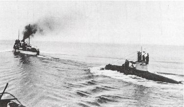 UB 14 на буксире австрийского миноносца выводят в море, в проливе Отранто миноносец пойдёт обратно в Каттаро, а лодка двинется в Орак.